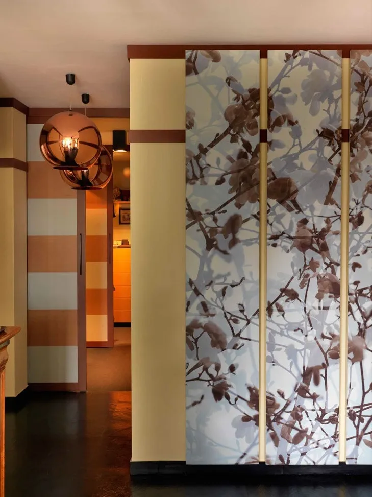 Alle pareti listellature di legno evocative dei tatatmi delle case giapponesi , fanno da appoggio a quadri e fotografie d’autore.